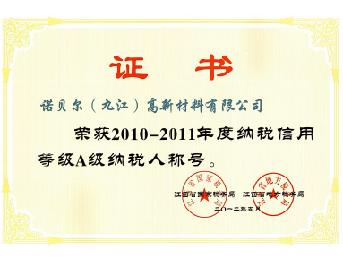 榮獲“2010-2011年度納稅信用等級(jí)A級(jí)納稅人”榮譽(yù)