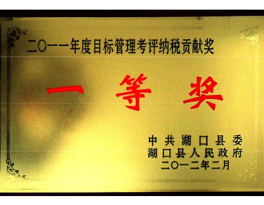 中共湖口縣委、湖口縣人民政府聯(lián)合授予“2011年度目標(biāo)管理考評(píng)納稅貢獻(xiàn)獎(jiǎng)一等獎(jiǎng)”榮譽(yù)
