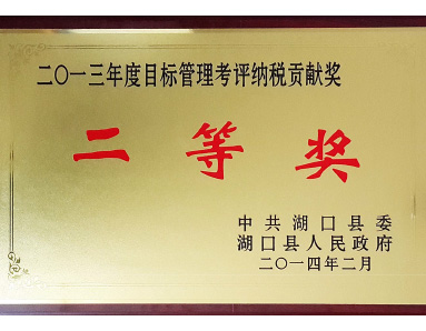 中共湖口縣委、湖口縣人民政府聯(lián)合授予“2013年度目標(biāo)管理考評(píng)納稅貢獻(xiàn)獎(jiǎng)二等獎(jiǎng)”榮譽(yù)