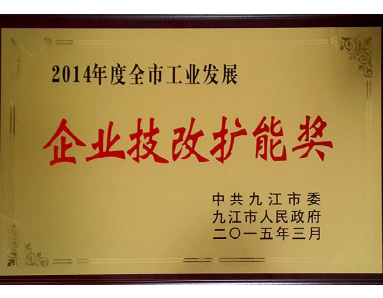 中共九江市委、九江市人民政府聯(lián)合授予“2014年度全市工業(yè)發(fā)展企業(yè)技改擴(kuò)能獎(jiǎng)”