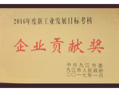 中共九江市委、九江市人民政府聯(lián)合授予“2016年度新工業(yè)發(fā)展目標(biāo)考核企業(yè)貢獻(xiàn)獎(jiǎng)”榮譽(yù)