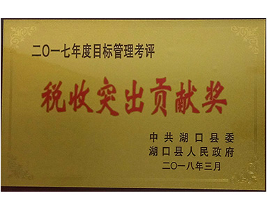 中共湖口縣委、湖口縣人民政府聯(lián)合授予“2017年度目標(biāo)管理考評(píng)稅收突出貢獻(xiàn)獎(jiǎng)”榮譽(yù)